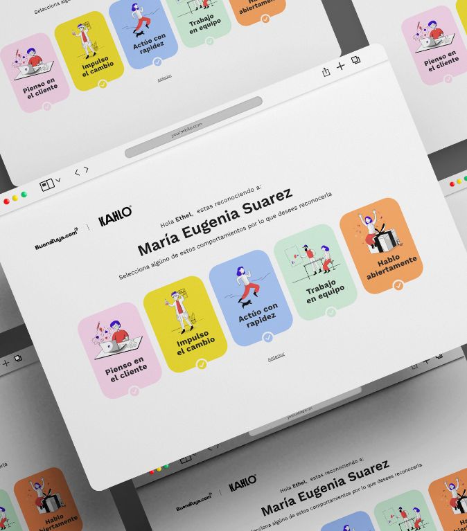 En Kahlo Agencia desarrollamos BuenaTuya, una plataforma que redefine el reconocimiento corporativo a través de tecnología, branding y diseño innovador. Una solución fresca y adaptada a las necesidades actuales de las organizaciones.